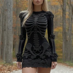 Product title: VChics Women’s Halloween Skeleton Flower Art Embroidery Cozy Knit Mini Sweater Dress Intricate 3D bone structure, realistic lace texture, professional depth-of-field lighting. Describe other features. Does AI-generated imagery materially alter consumer expectations?VChics Women’s Halloween Skeleton Flower Art Embroidery Cozy Knit Mini Sweater Dress